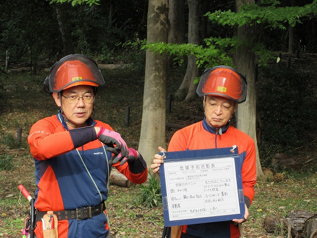KY活動(危険予知)では頭上の掛かり木の危険ポイントを共有。