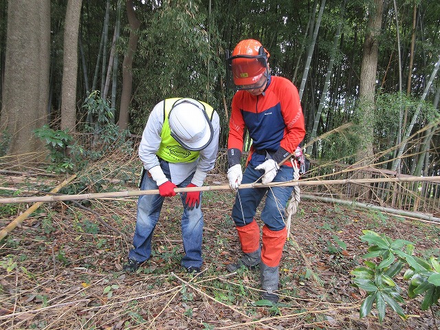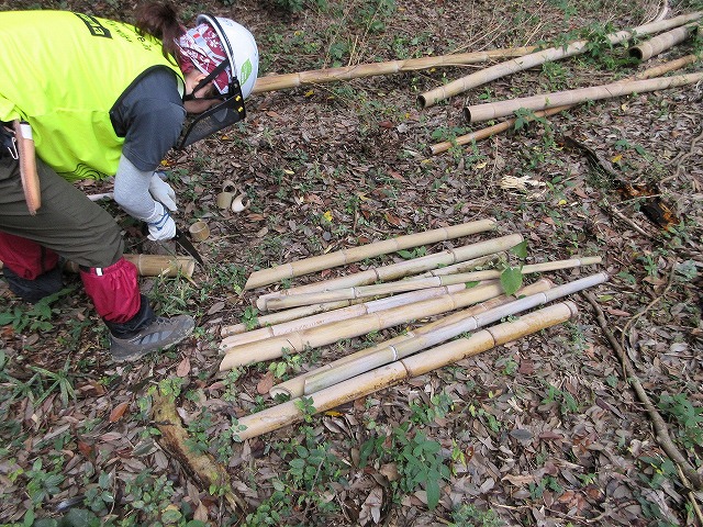 本日の作業は、樹林内に放置された間伐竹の整理と竹を活用した粗朶柵のつくり直しです。
