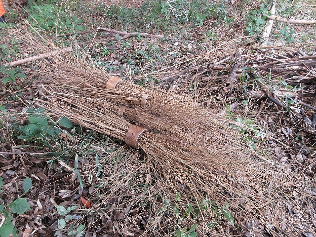 枝を集め、竹の輪切りを利用して枝の拡がりを抑え粗朶柵の材料として使いやすくしています。