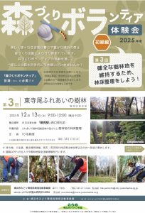 森づくりボランティア体験会(森ボラ体験会)は、「森づくりをやってみたい!」と思った方と、手入れを必要としている市内の緑地との橋渡しをお手伝いするプログラムです。