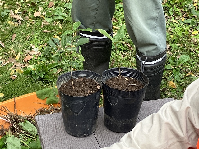 木の近くで発芽した実生はポットに植え直して育てているとのことです