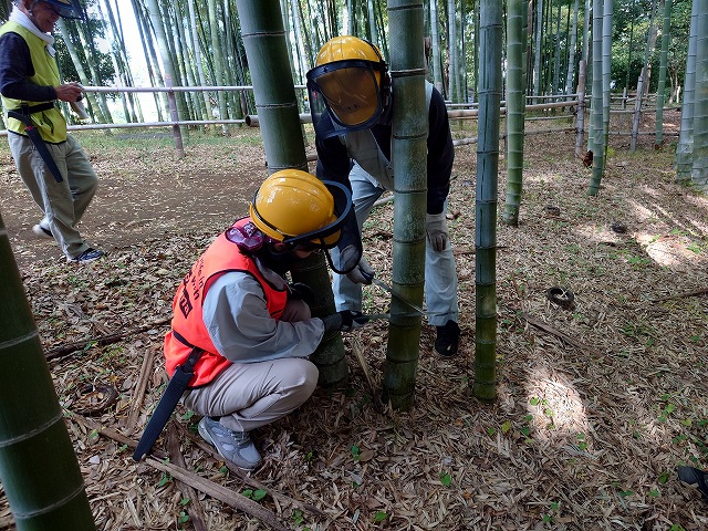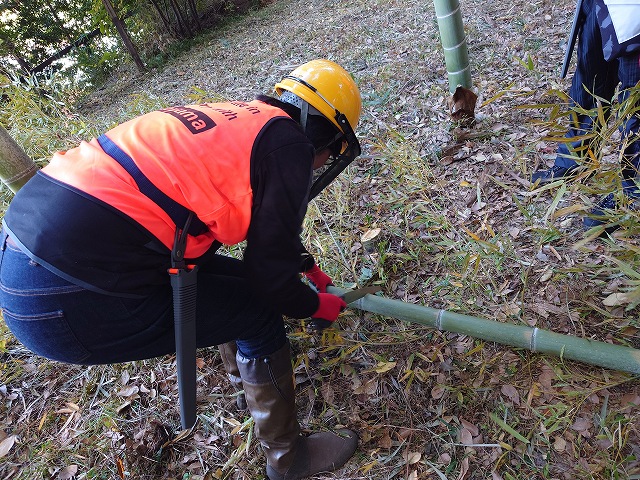 二チームに分かれて活動 Aチームは竹の間伐から 竹の切り方をレクチャーして頂きました