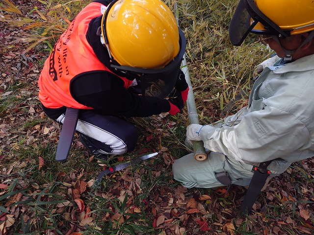 愛護会のみなさんに教わりながら、伐採、玉切り、枝払いをおこないました