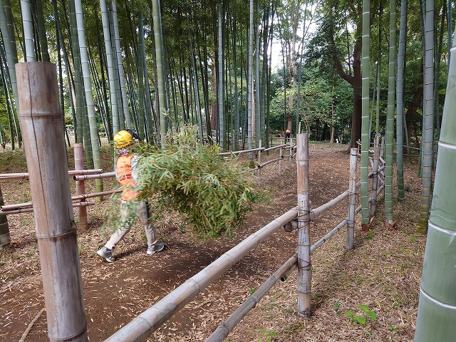 今回は、竹園路に仮置きしてある竹の搬出・運搬、集積と竹の間伐を愛護会のみなさんと一緒に行いました。