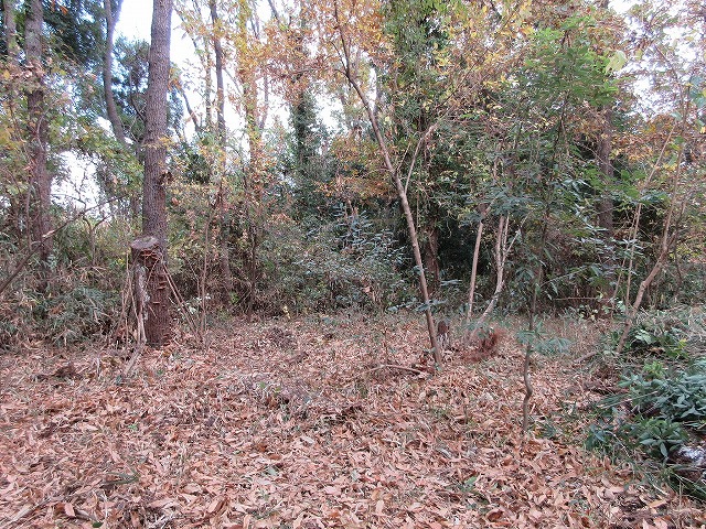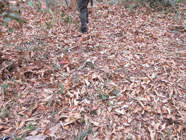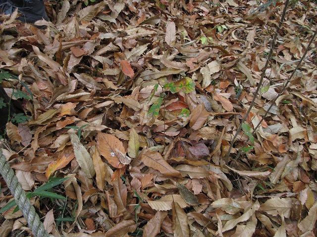 作業エリアの足元は落ち葉が厚く堆積しています。コナラの実生も確認できます。