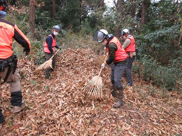 落ち葉が堆積したままでは作業し辛く、また埋土種子(落ち葉の下の土の中で休眠している種子)が発芽できないため、地表に陽が入るよう落葉掻きを行います。