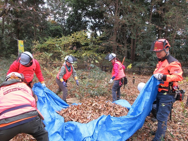 集めた落ち葉はブルーシートで落ち葉溜めへ。
