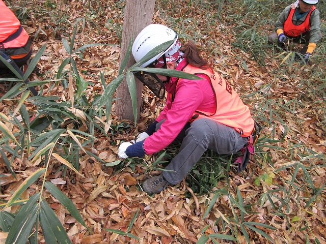 背丈程のアズマネザサが密集し足元には倒木などもあり手強い作業です。