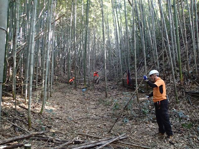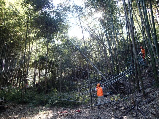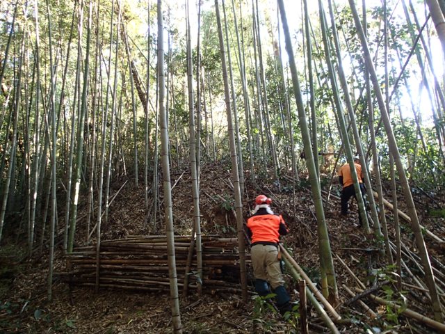 竹林内に陽の光を当たるようにするために、南側斜面の竹の間伐も進めました。