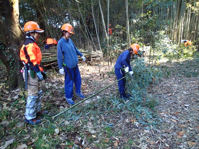 竹林整備が初体験の若者たちが、竹の枝払いに挑戦中