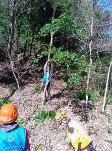 ロープを使って、安全に木を倒せるよう準備し、邪魔な枝は最初に切っておきます