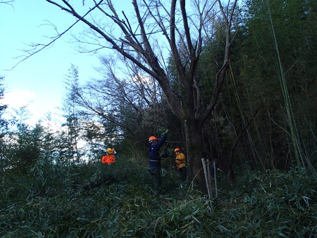 竹の浸食によって樹勢が弱まってしまった桜の木を保護しています。